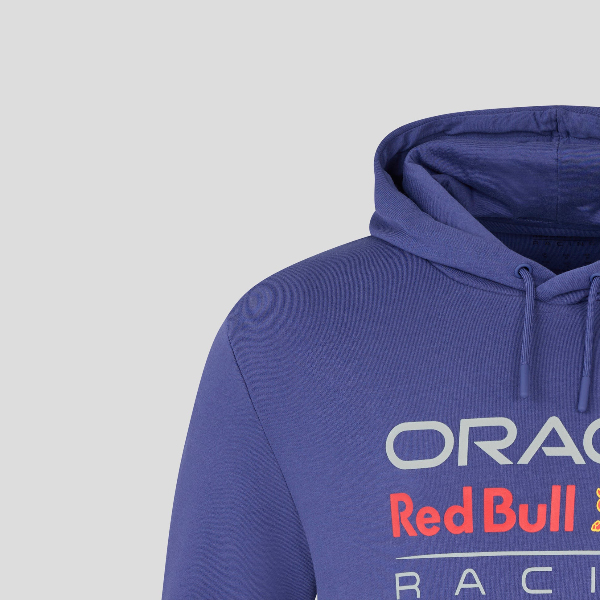 Oracle Red Bull Adults Large Logo Hoodie. ORBR Red Bull unisex hoody featuring large Oracle Red Bull racing logo. This casual fanwear for the Red Bull Formula 1 fan is in Skipper Blue but is also available in Night Sky & Weathervane Grey