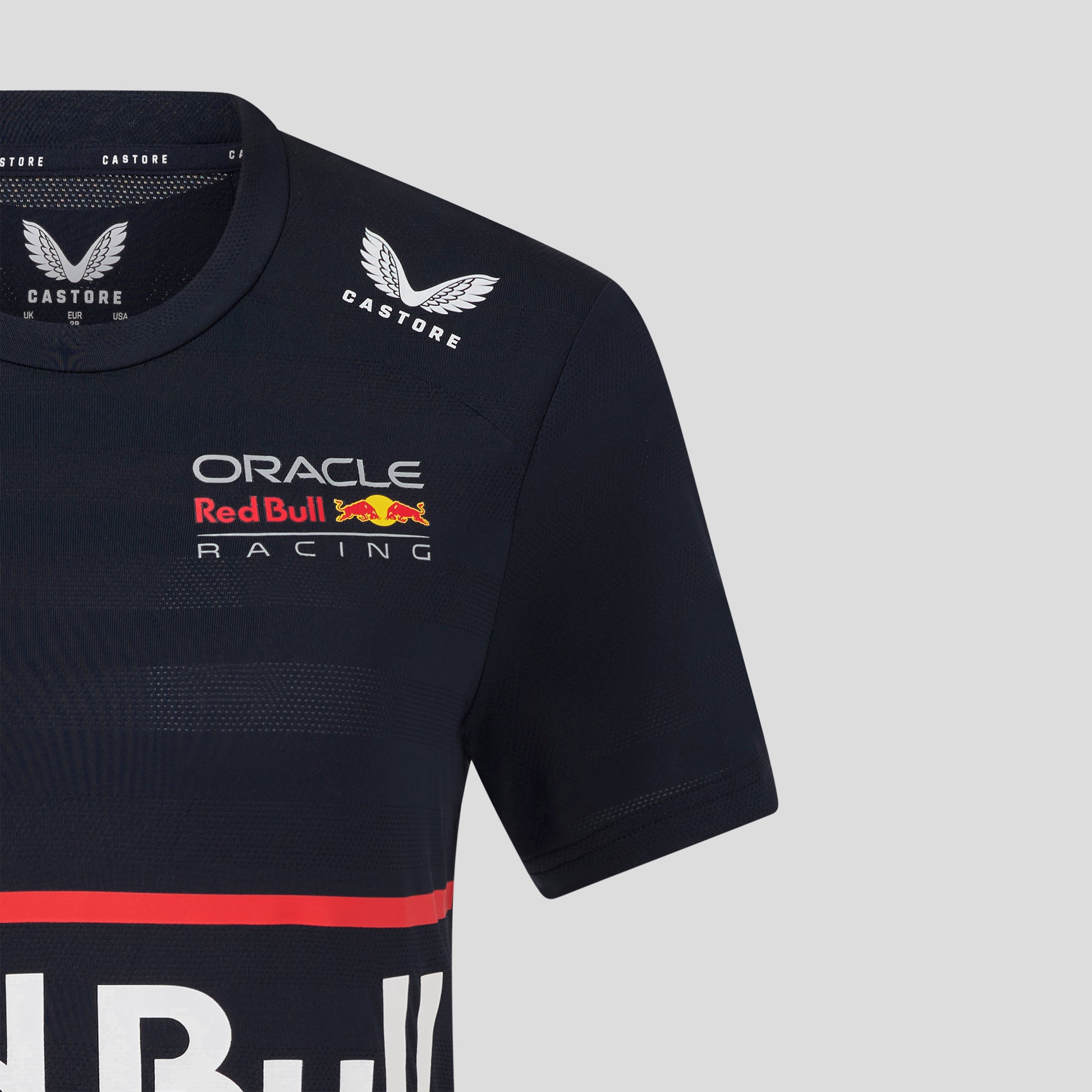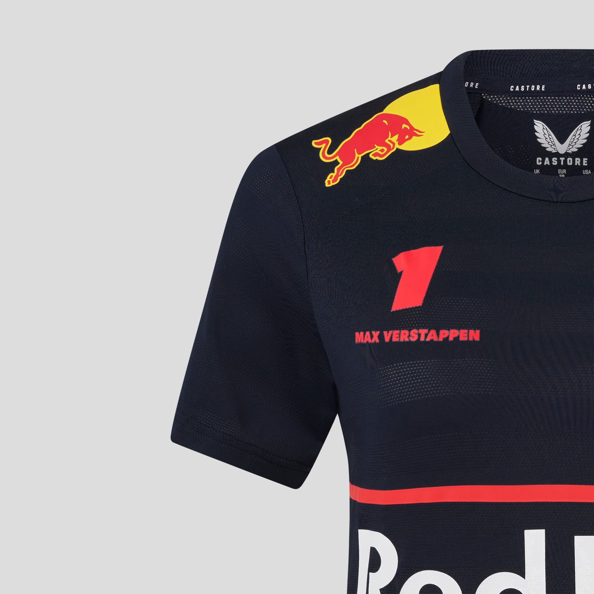 Oracle Red Bull MV F1 Driver Racing Tee Shirt. Womens T-shirt featuring Max Verstappens Formula 1 racer number "1". The back of the tee features the iconic charging Bulls logo.
