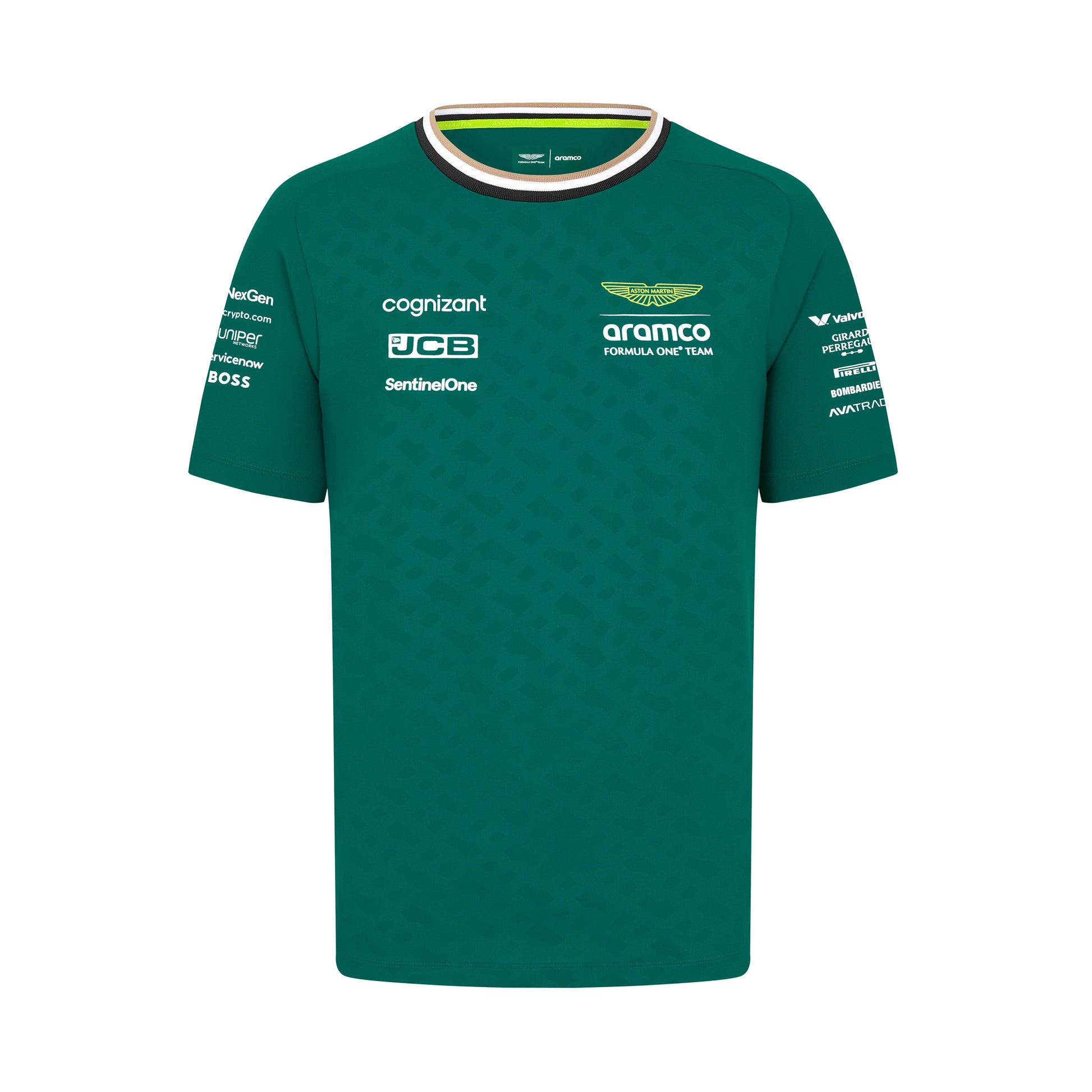 As worn by the Aston Martin Formula One Team during the 2024 F1 World Championship, this smaller size tee shirt for kids is the perfect way to get race ready. Aston Martin Aramco F1 Team logos and partner logos finish the look, with a BOSS neck stripe