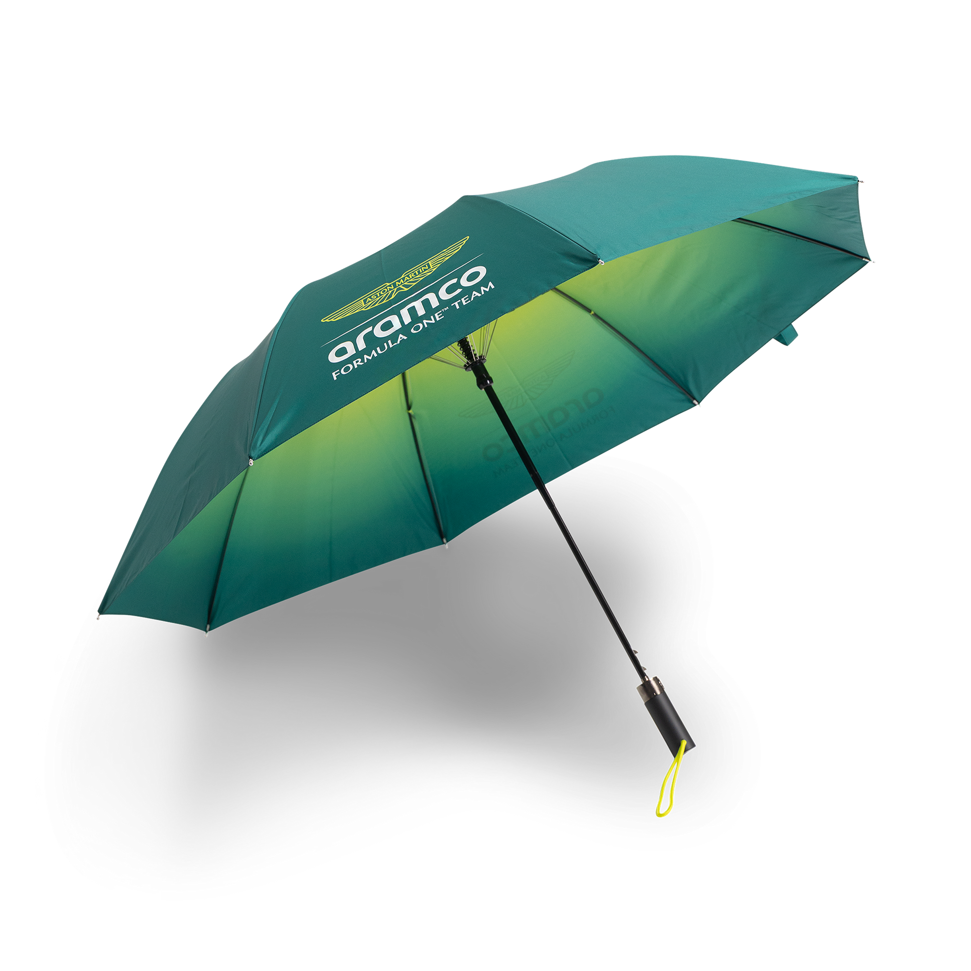 Stay dry in style with the Aston Martin F1 Umbrella in green. This unisex umbrella features durable construction, a large canopy, and official Aston Martin Formula One Team branding, making it perfect for race days or everyday use.