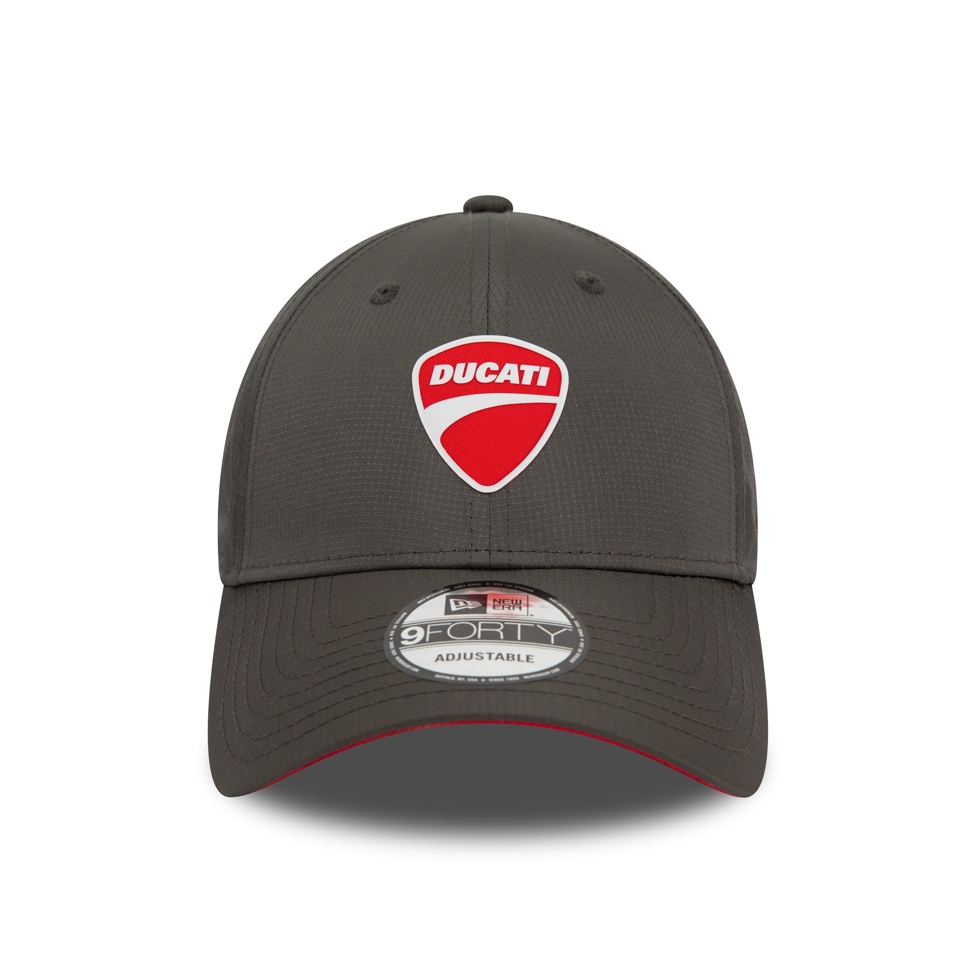 Ripstop Ducati Cap with Ducati logo, contrast under peak in red and metal d-ring closure. Made by and featuring the New Era flag.