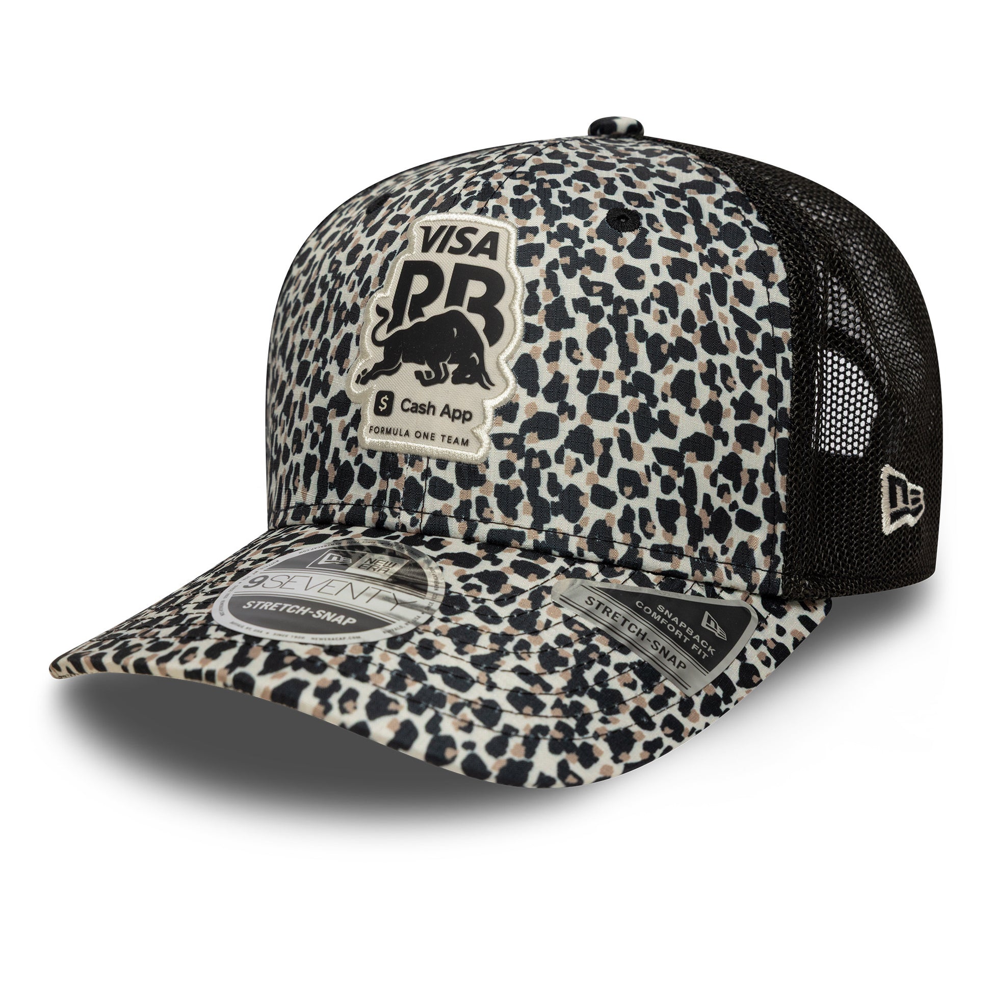 The Visa Cash App RB F1 Leopard 9Seventy Stretch Snap Cap – Stone combines bold Red Bull Racing style with a standout leopard-print design.